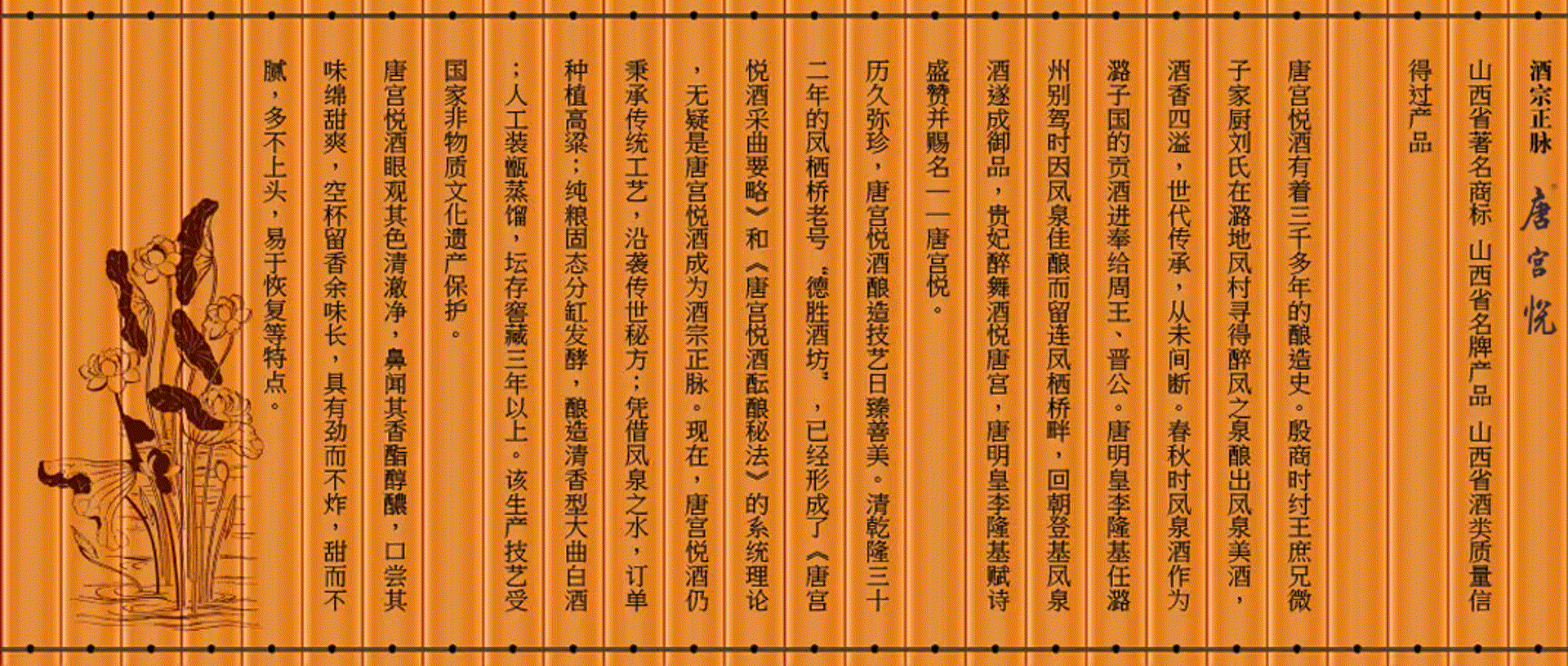 鳳棲橋釀業(yè)有限公司歷史悠久。從殷商微子家廚劉氏尋鳳泉釀酒至今,已有三千多年釀造史。劉氏后裔代傳代善, 才有唐明皇李隆基賜名“唐宮悅”,到清乾隆三十二年的鳳棲橋老號“德勝酒坊”已形成了《唐宮悅酒采曲要略》和《唐宮悅酒醞釀秘法》的系統(tǒng)理論的系統(tǒng)理論,直至建國初期的一九五二年才被當(dāng)時(shí)的潞城邊區(qū)酒坊所接管,一九七四年改邊區(qū)酒坊成立國營潞城縣酒廠,二00六年改制為現(xiàn)公司公司地處晉冀豫三省通衢素有“商賈云集旱馬頭”美譽(yù)的微子古鎮(zhèn)……【詳細(xì)】 |